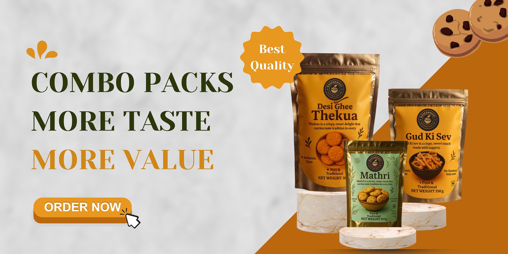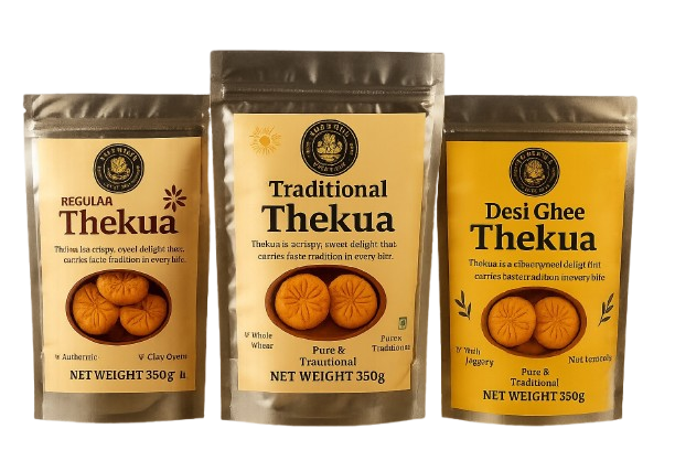 Premium Pack – Regular Thekua 350gm + Ghee Thekua 350gm + Traditional Thekua 350gm + Free: Flavoured Nimki 50gm
