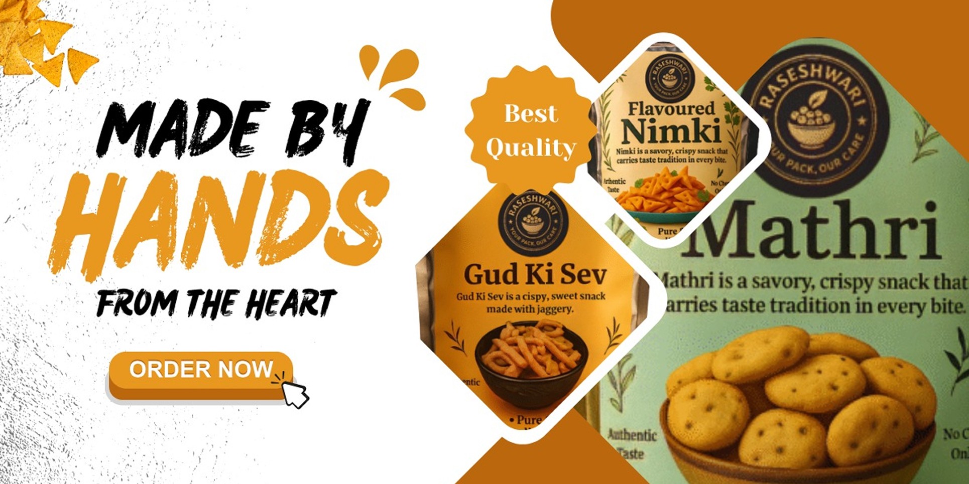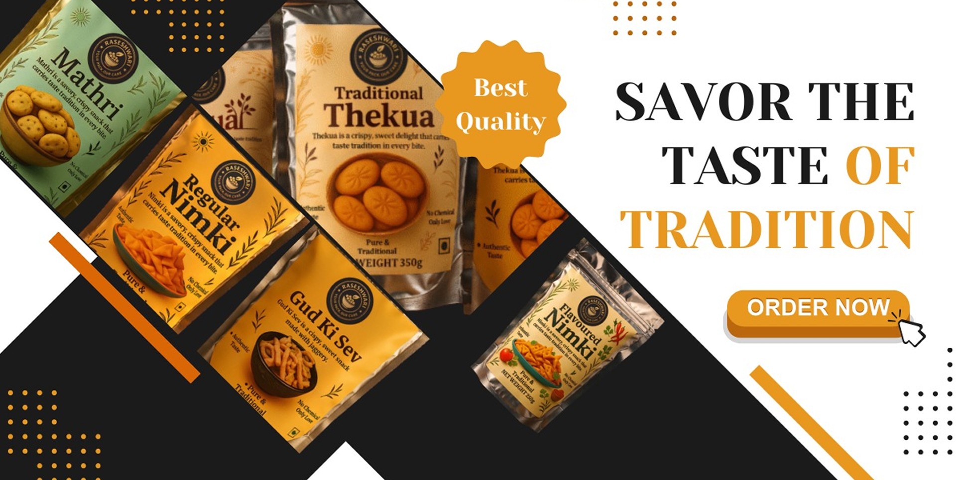 All products are packed in hygienic, FSSAI-certified facilities using traditional-themed packaging that ensures freshness and safety.